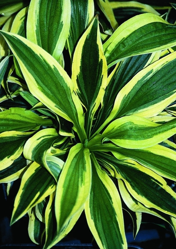 This new reverse of the favorite Hosta 'Sitting Pretty' was discovered by renowned nurseryman Roy Klehm. The black-green, lance-shaped foliage, bordered with a wide creamy edge, forms a symmetrical, 18" wide clump. In summer, the vigorous-growing clumps are topped with 20" scapes of lavender flowers.