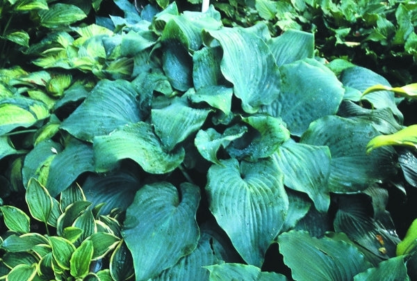 Hosta 'Lederhosen' is one of the more unique hostas ever hybridized by the late Herb Benedict. This 18" tall x 3' wide clump is composed of thick, rubbery, ruffled, blue-green leaves which reminded Herb of leather britches (lederhosen). Anyone who would name one hosta 'Little Stiffy' and another 'Nooner', only makes one wonder about the real story behind 'Lederhosen'. In late summer, the clumps are topped with stalks of large, fragrant, light lavender flowers. I'll bet you never dreamed leather britches could smell this good. You won't even need a label for this unique hosta.