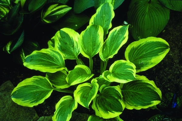 This small Jim Dishon hybrid (H. 'Galaxy' x H. 'Hadspen Heron') makes a slow-growing but delightful 15" wide clump of dark green heart-shaped leaves, each with an unusual rippled orange-gold margin. The margins change to a creamy yellow as the season progresses. The clumps are topped with 13" scapes of light lavender flowers in early summer.