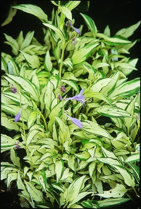 (aka: H. venusta 'Variegated') If you like small hostas, then this one's for you (borrowed the line from a beer ad). These tiny clusters of white-centered leaves are edged in a two-toned, dark green color. This vigorous grower is perfect for the morning sun to light shade rock garden. It performs best with good morning sun. In late spring, the 10" wide clumps are topped with lavender flowers on 12" tall scapes.