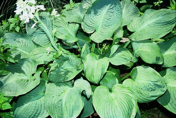 This giant blue-grey hosta from the Petryszyn breeding program is indeed a breakthrough plant. Each 5' wide clump stands upright, with the slightly rippled, blue-grey leaves held outwardly. In midsummer, the enormous clumps are topped with 40" branched scapes, each ending in pure white flowers. Clumps must become established before scape branching is observed.