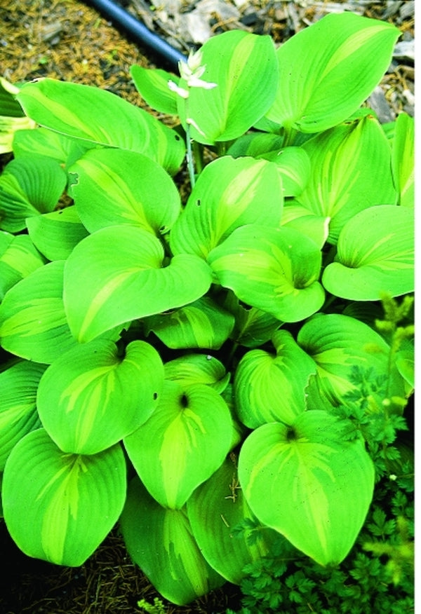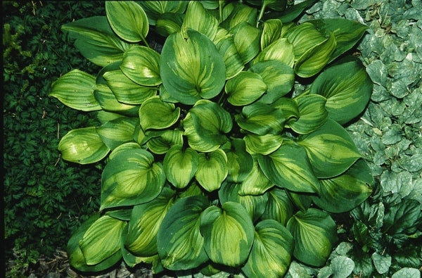 Not many hostas catch my eye like the first time I saw H. 'Olive Branch' in the garden of Don Dean...this was truly one unique hosta. Although it's hard to visualize such a beauty...especially after too much scotch (I mean butterscotch), imagine a butterscotch-centered, green-edged sport of H. 'Candy Hearts' and that's the plant. Each perfectly symmetrical 2' wide clump is topped with a nice display of purple flowers on 20" scapes in early summer. This is a true delight!