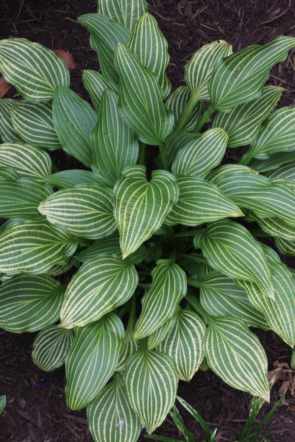Hosta 'Mito-no-hana' is one of the most highly coveted hostas in the world, so we were thrilled to offer it in limited quantities for the first time in 2022. This eye-popping selection of the Japanese Hosta rectifolia comes from Japan's Tenjin Yama Bunen Nursery in Mito City. Hosta 'Mito-no-hana' forms a spectacular 15" tall x 2' wide clump of oblong green leaves with screaming yellow veins. The color of the veins gradually diminishes with summer heat to mostly green, but returns each spring, or in the fall, if plants are cut to the ground in summer and allowed to re-flush. The clumps are topped with 30" spikes of dark lavender flowers. The best leaf coloration comes in open shade or with a couple of hours of morning sun. Do not grow this in deep shade or you'll just have another green hosta.
