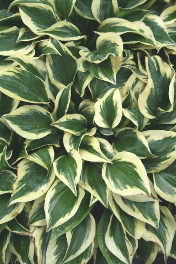 We were very excited to grow this new Terra Nova introduction, a very wide-edged sport of one of our favorite hostas, H. 'Veronica Lake'. This small, 8" tall x 18" wide clump is composed of thick, heart-shaped, blue-green leaves bordered with a 1" wide, creamy border that emerges yellow in spring...probably a tetraploid. The eye-popping clumps are topped in midsummer with 15" spikes of lavender flowers.