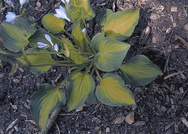 This is another splendid new sport from the old favorite H. 'Birchwood Parky's Gold'. In patterns, this is the exact opposite of H. 'Parky's Prize', being composed of golden leaves, each surrounded by a 1/2" wide green margin. In early summer, the vigorous-growing, but densely compact, 45" wide clumps are topped with attractive 30" tall scapes of light lavender flowers.
