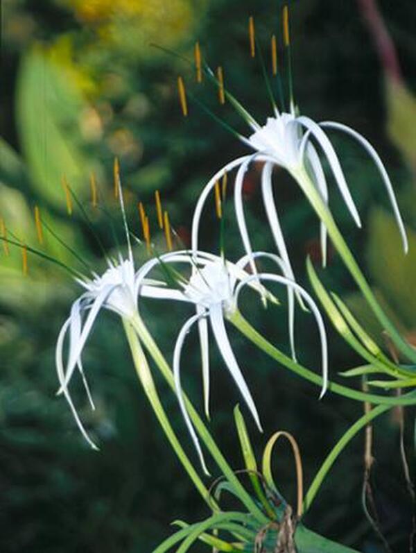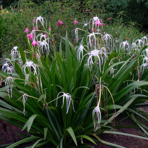 Hymenocallis 'Tropical Giant Sister' is an amazing hymenocallis that makes a 3' wide clump of 30" long, glossy green leaves topped, starting in mid-June, with numerous 4'+ tall flowering spikes. The nocturnal, sweetly-fragrant flowers are composed of a central white cup, surrounded by long white sepals measuring an amazing 11" from tip to tip. Each spike holds up to a dozen flowers on long 6" pedicels. For us, it is the earliest flowering of the giant Mexican spider lilies, starting in late June (NC)...nearly a month before Hymenocallis 'Tropical Giant', which appears to be a different species. Hymenocallis 'Tropical Giant Sister' prefers a moist soil, but is very tolerant of extended dry periods. Thanks to the late bulb guru, Thad Howard, for sharing this just prior to his death.