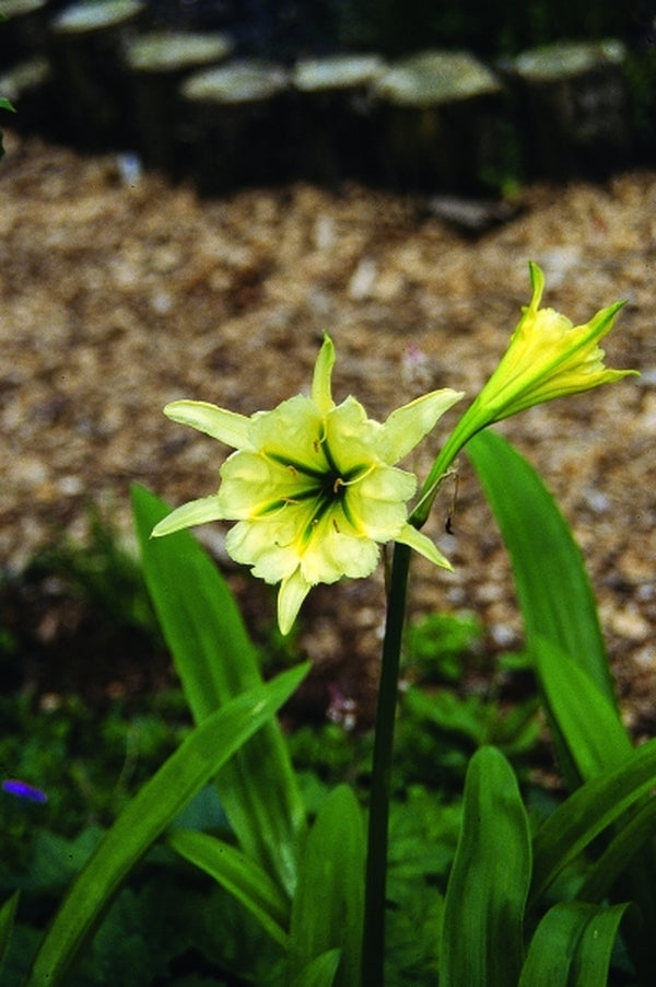 (aka: Hymenocallis 'Sulphur Queen') This easy-to-grow bi-generic hybrid of Hymenocallis narcissiflora and the Peruvian native Ismene amancaes is one of the most stunning flowers in our summer garden. Here, it has prospered for many, many years (unlike many of the high altitude pure Andean species of Ismene). The 18" long, green strap-shaped leaves emerge from the underground bulb in late spring. In July, each flowering stalk emerges from the base and opens at 18" in height to reveal 2-3 large trumpet-shaped, soft yellow flowers highlighted with a large, dark green star-pattern in the center. Did I mention the wonderful fragrance? x Ismenocallis 'Sulfur Queen' grows best in dry conditions.