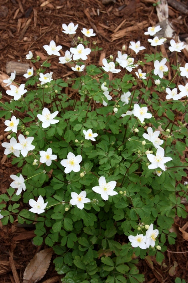 One of our favorite winter woodland perennials that starts flowering even before most hellebores is our native false rue anemone, Isopyrum biternatum. As we've botanized across the country, we've noticed the largest flower forms seem to occur in the coldest parts of the country. This particularly large-flowered strain comes from the former southern Minnesota garden of plant breeder Hans Hansen. The pure white daisies, which top the 8" tall airy foliage starting in late January (NC), are more than double what we typically see with Isopyrum biternatum. Like all early spring ephemerals, false rue anemone goes summer dormant for us by June, so mark the spot. Average to slightly moist, rich, moderately high pH soils grow the best false rue anemone. The dormant rhizomes are always miniscule, so save your complaints for mother nature.