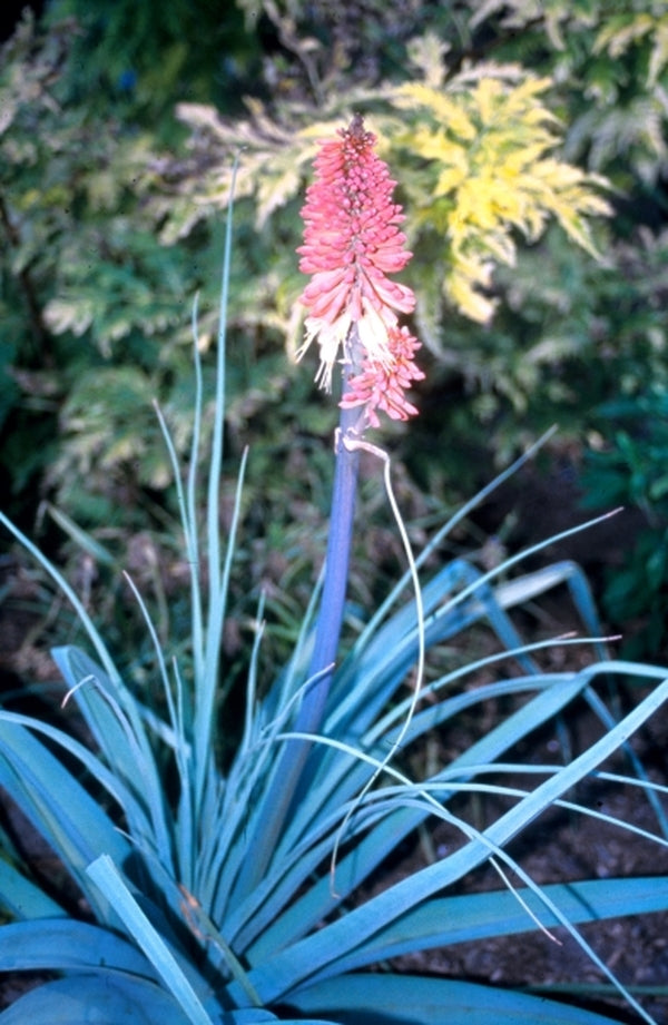 We saw this growing from moist peaty seeps up to 8000' in elevation at South Africa's only ski resort during our 2005 expedition. When we first saw the evergreen glaucous foliage and splendid architectural form (like a blue octopus after rigor mortis sets in), we realized this was indeed something special. Although I'd grow this species for the foliage only, the clumps are topped with 4' tall spikes of huge toilet brush-sized pokers in July/August. Each poker is bright orange at the top with a distinctive wide yellow band at the bottom of the flower. Kniphofia caulescens has proven to be amazingly easy to grow in typical garden conditions, so give it a try.