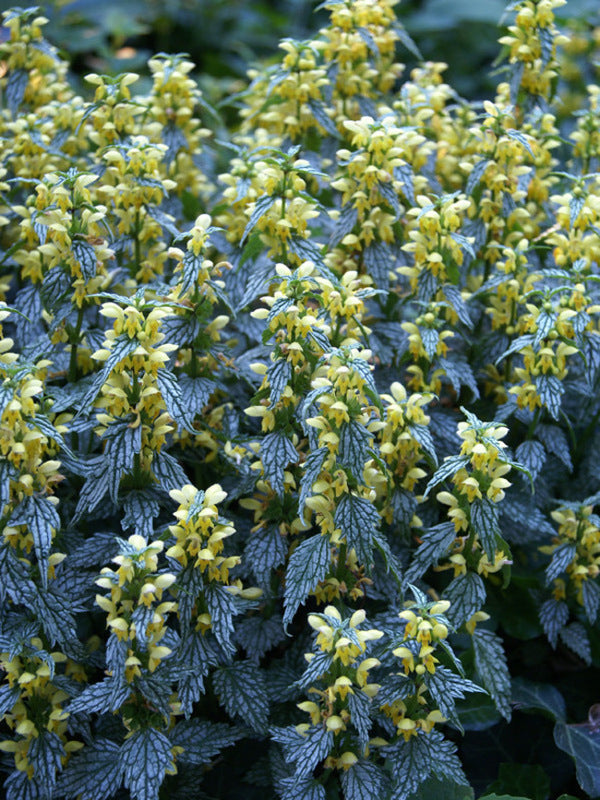 Lamium 'Herman's Pride' is a dwarf groundcover that forms a spectacular clump 8" tall x 14" wide patch of small diamond shaped leaves....each medium green with spectacular silver veining. The clumps are covered with yellow flowers occurring in the leaf axils in the spring...a great highlight plant for the slightly moist woodland garden.