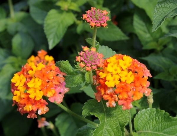This selection of lantana was introduced by the former Goodness Grows Nursery in Georgia, from who else, Miss Huff of nearby Athens. In our trials, this is the hardiest lantana, with well-established clumps surviving short durations of -3 degrees F. The deer-resistant plants emerge from the ground in early May and within a couple of weeks are covered in showy orange (RHS 28A), yellow (RHS 17A), and pink flower heads that are produced nonstop until frost. Virtual sterility also prevents unwanted seedlings and promotes more flowering...and more hummingbirds. Established clumps will get quite large (to 10' spread) when happy! For full hardiness, establish well prior to winter and do not cut old stems in fall or winter when grown in marginal climates.