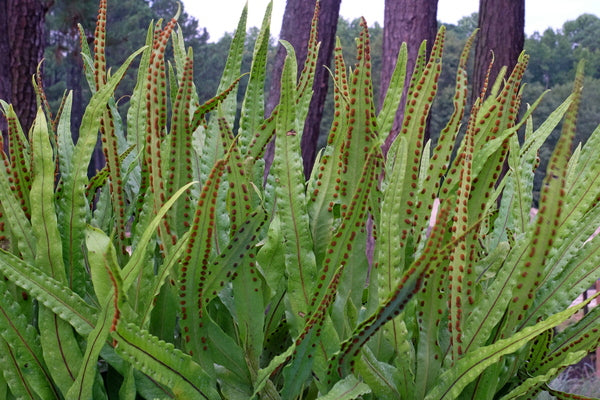 Lepisorus macrosphaerus is a Chinese epiphytic fern that can be found growing on rocks and trees from 3,000' to 10,000' elevation in the Chinese provinces of Guizhou, Hubei, Sichuan, Xizang, and Yunnan. The 16" tall green ribbons are held perpendicular to the pencil lead-thin climbing rhizome. When mature, the leaf backs are prominently adorned with large spherical brown spore cases. We have found Lepisorus macrosphaerus easy to grow in containers and have overwintered it successfully in the ground, growing on slopes in well-aerated, compost-rich soils.