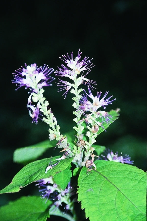 (syn: Comanthosphace stellipilum) From the mountainous woods of Japan, here's one for the folks who are into the truly obscure. This shrubby member of the mint family acts like a perennial with 2-3' tall stems, clothed with fuzzy green leaves. Until it's ready for sex, it looks pretty dull and uninteresting (sound familiar?). Finally, in the fall (October in NC), each clump is topped with dozens of the coolest, reddish-purple, bottlebrush flower spikes! No one ever notices the shrub mint until fall, then all I hear is WHATZIT and WHERECANIGETIT?