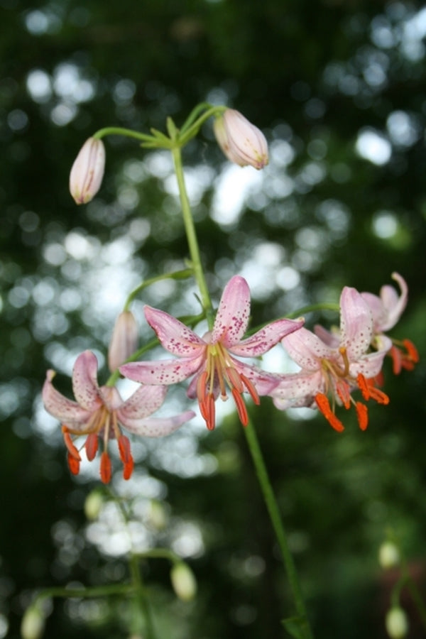 This vigorous Martagon lily hybrid (Tarlton 1988) makes a 3' tall stalk of whorled leaves, topped in late May-June (NC) with spikes of up to a dozen pendent flowers, each light pink with darker spots...great to blend with ferns in the woodland garden.