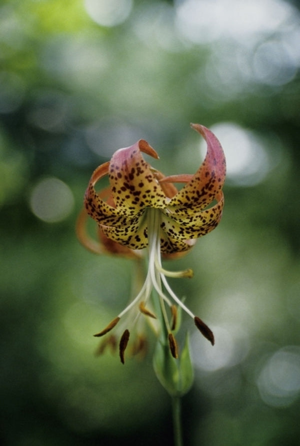 This recently named lily, found sporadically in 16 counties in NC/Virginia, was first thought to be a disjunct population of the federally endangered L. iridollae and at times considered as both L. superbum and L. michauxii. After exhaustive analysis, it was christened a new species, L. pyrophilum. This long-leaf pine habitat endemic is found in full sun, growing in sandy pitcher plant bogs. L. pyrophilum grows from an unusual horizontally expanding, branched rhizome, giving rise to 4' tall stems clothed with narrow, glossy green leaves. The stems are topped in mid-July (slightly later and smaller than L. superbum) with 5-7 large, pendent, orange flowers with a yellow throat and abundant, dark brown spots. As a summer butterfly magnet, it rivals Joe-Pye weed. Our plants are nursery-propagated from a single clone.