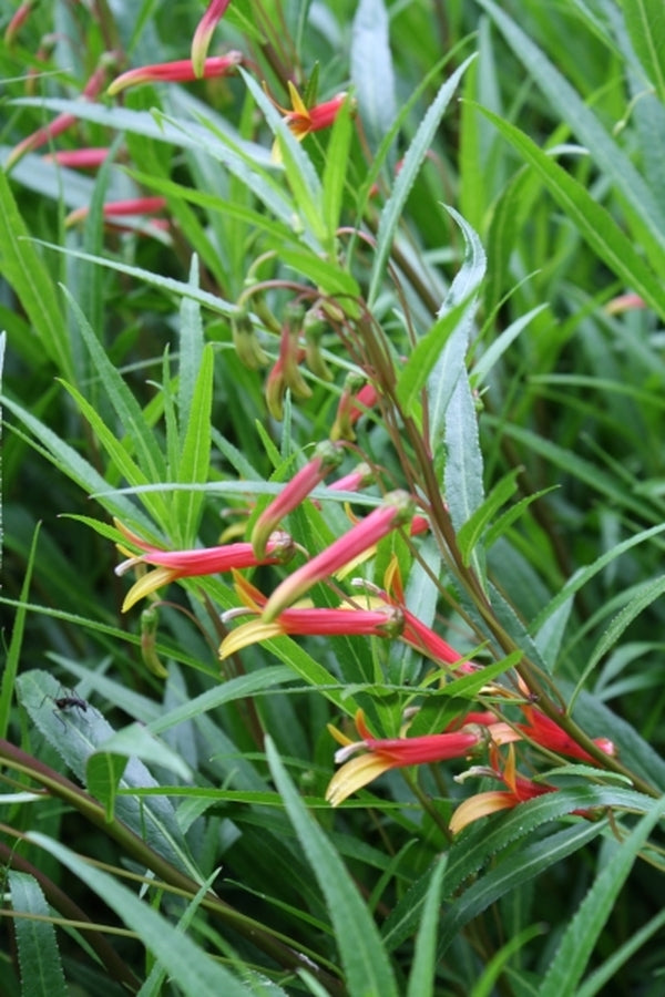 Since 2003, we have enjoyed this adaptable and easy-to-grow cardinal flower from the Sierra Madre Occidental mountain range (southern Arizona south into northern Mexico). Lobelia laxiflora is one of those rare plants that grows equally as well on the West Coast as it does on the East Coast. The riparian woodland native is stoloniferous, forming patches can reach 5' wide in 8 years, composed of 2' tall, semi-lax stems, clothed in 5" long pencil-thin green leaves and adorned starting in early May (NC) with candy corn-like tubular red and yellow banded flowers...a hummingbird favorite. We have found both wet and bone dry soils equally acceptable for growing Lobelia laxiflora var. angustifolia.