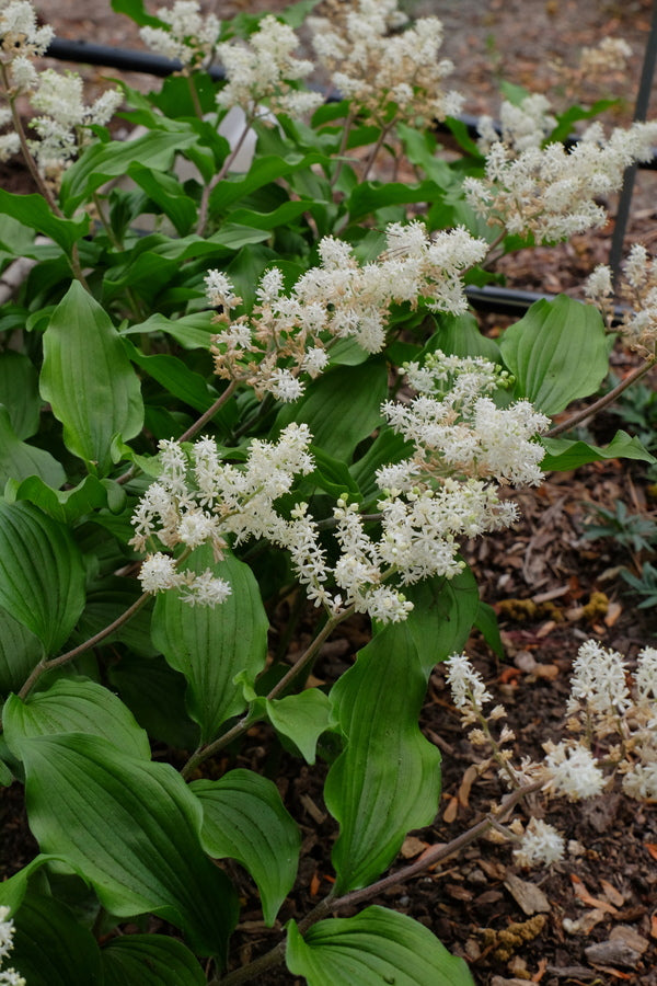 (aka: Smilacina japonica) Maianthemum japonicum 'Korean Treasure' is a 2021 Plant Delights/JLBG introduction, with a long tale to tell. We originally got our start of this gem from the former Minnesota garden of plantsman Hans Hansen, who purchased it from the former Heronswood Nursery. Heronswood got seed and subsequently sold un-flowered seedlings from Korea's Chollipo Arboretum as the Korean native Maianthemum bicolor. Instead, it turned out to be a highly growable form of the often heat and humidity intolerant Korean/Chinese native Maianthemum japonicum, that we've given the clonal name, Maianthemum 'Korean Treasure'. For us, it emerges in late March (NC), and the tight clump of 15" long, arched stalks are topped with terminal cluster of frothy white flowers in April...a great addition to the woodland garden.