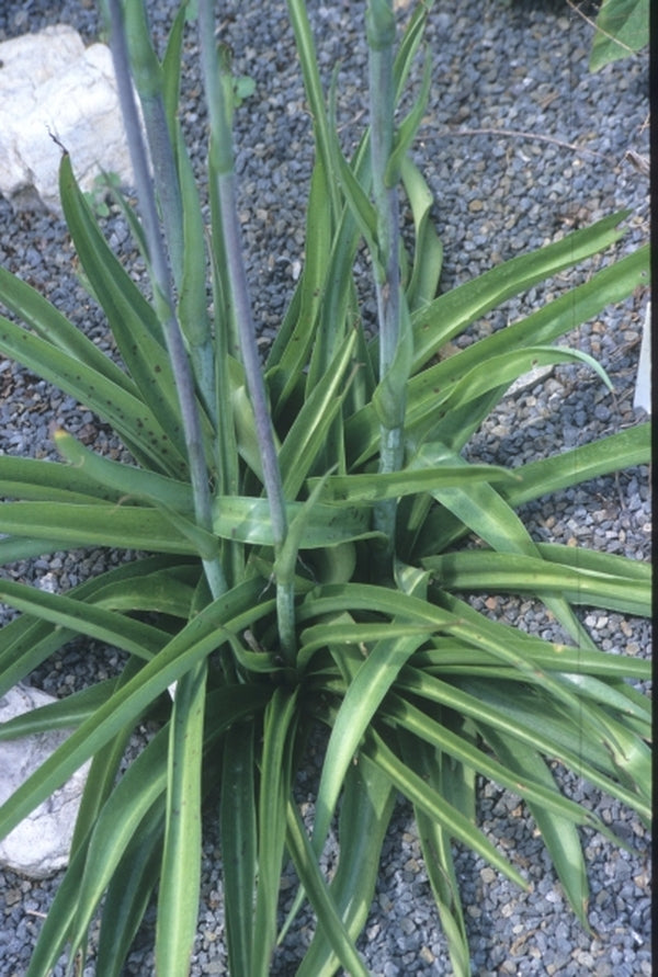 Although it's rarely offered for sale, our native deciduous agave should be grown in every garden where it's hardy. This easy-to-grow, drought-tolerant perennial, native from Illinois south to Florida, makes a flat rosette of fleshy green leaves, often spotted liver-purple. Amazingly, Manfreda virginica has also thrived for years in southern Minnesota gardens. In midsummer, Manfreda virginica rosettes are topped with 6' tall flower spikes, ending in a floral cluster of amazing, tubular purple flowers with huge yellow anthers (related to tuberose). We have found these to be especially loved by hummingbirds. Some European taxonomists have lumped manfreda into the genus agave...if I catch 'em in a dark alley, I'll show 'em what lumping is really all about!