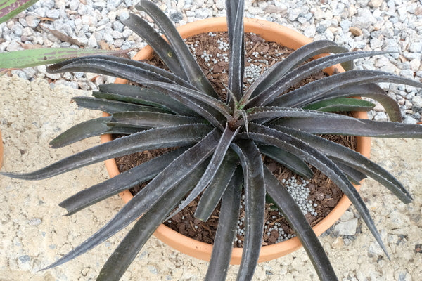 (aka: xMangave 14-157-6) xMangave 'Coffee Jitters' is a 2018 Walters Gardens release that was created by mixing two parts manfreda (Manfreda longiflora and Manfreda maculosa) with one part Agave marmorata. The result is a 6" tall x 2' wide, squid-like plant with narrow, rubbery, dark purple-brown foliage and tooth-like nubs along the deeply-channeled leaves. xMangave 'Coffee Jitters' is an elegant and architecturally interesting specimen for a color bowl or combination planter.