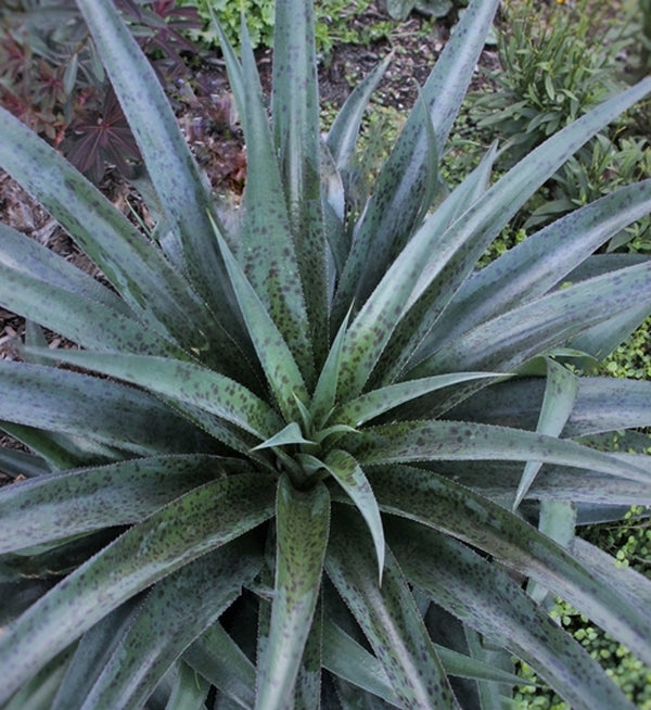 xMangave 'Jaguar' is an amazing agave hybrid with the little-known Manfreda guttata, which hails from 4,000'-8,000' elevation near the town of Tabasco, Mexico (Zacatecas state) and just south. Isn't anything involved with Tabasco going to be excellent? The fast-growing, tight offsetting 2' tall x 3' wide clumps are composed of olive green denticulate (toothed) fleshy leaves that are heavily spotted purple. The tall manfreda-like flower spikes usually occur in September/October. Reportedly, the flowers smell like "that of onions, cooked potato, cooked cabbage, or roast beef." Yeh, right...and I'm a master chef. Our offering is a splendid selection obtained from Dutch master succulent collector Cok Grootscholten.