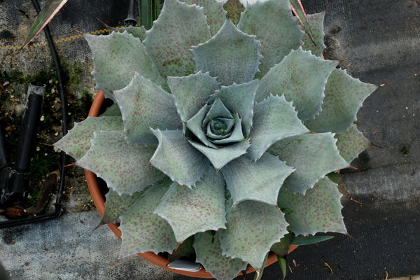 xMangave 'Sponge Paint', a 2019 release from Walters Gardens, is an Agave potatorum hybrid that forms a 6" tall x 14" wide, flat rosette of glaucous grey leaves, each highlighted by an abundant array of purple spots...a superb small container specimen where it isn't winter hardy.
