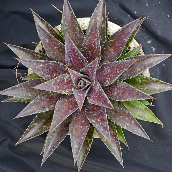 xMangave 'Thunderbird' is a new agave x manfreda hybrid that forms a small 8" tall x 12" wide clump, with leaf spotting so dense the foliage appears solidly reddish-violet...quite dramatic! 'Thunderbird' consists of two parts manfreda and one part Agave marmorata...shaken thoroughly and stirred. Unlike agaves, xmangaves don't die after flowering.