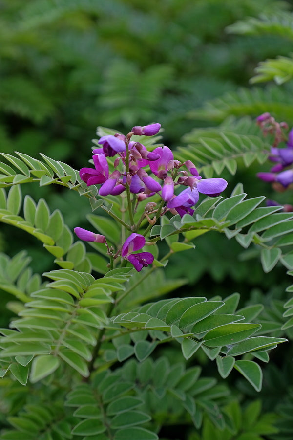Millettia pulchra is one of many ornamental legumes...first cousin to the better known genus, indigofera. Millettia pulchra forms a large shrub/small tree that can be found in open woodlands and thickets over a wide part of Asia, from India though China, and into Vietnam. In the garden, Millettia pulchra forms a 10' tall x 10' wide mass of stems, bearing attractive, soft-textural mimosa-like foliage. The clusters of small purple flowers, which adorn the plant from late spring thru summer are found at the terminal leaf axils. If Millettia pulchra is too big for your garden, cut it down, grind it up, and sell it to cancer researchers, who know it as Yulangsan. In China, the dried roots have long been used to boost the immune system, and now are being used to boost the performance of chemotherapy drugs.