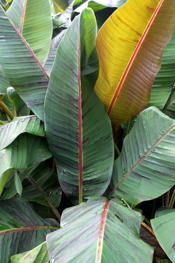 Musa 'Picasso' is a name we gave to a previously unnamed group of hybrid seedlings from a cross of Musa laeterita x Musa sikkimensis that came to us originally as seed from India. For us, Musa 'Picasso' is one of the shortest of the hardy bananas, topping out for us at 12' tall. The leaves are a lovely green with dark purple streaks, while the back of the leaves emerge a nice cinnamon red. Based on the parentage, we would expect Musa 'Picasso' to be winter hardy to about 5 degrees F, but that's an educated guess at this point. If you're into hardy bananas and like experimentation, then Musa 'Picasso' is for you.