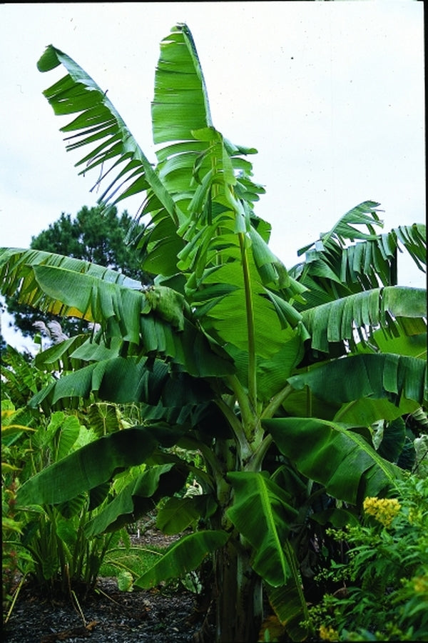 Musa 'Rajapuri' is one of our favorites of the cold hardy bananas and it actually produces an edible, good tasting banana. M. 'Rajapuri' only reaches 8' tall, but it is twice as wide due to the giant tropical green leaves. M. 'Rajapuri', which is a midget by banana standards, makes up for its small stature by being able to flower in only 9 months, compared with 18 months for most varieties. Here in Zone 7, we recommend caging the trunk in the fall and filling the cage with shredded leaves for winter protection.