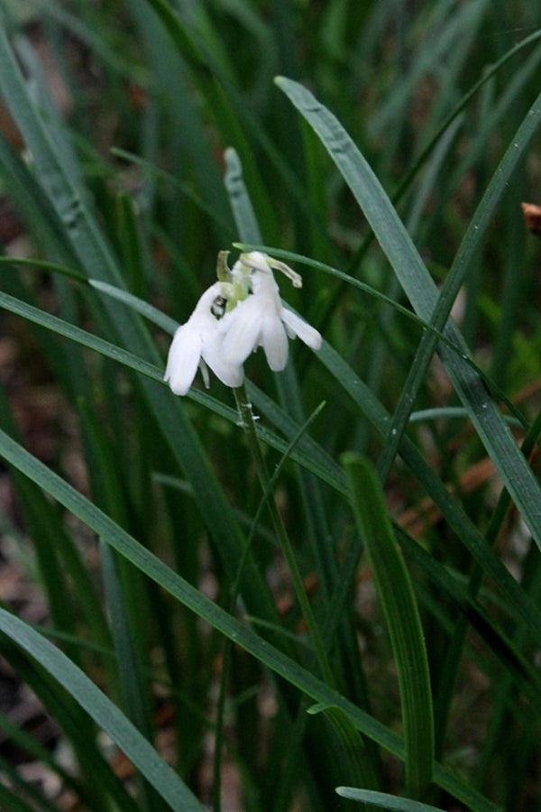 This collection of the little-known Ophiopogon bodinieri comes from a Rarefind collection in Tibet at 10,000' elevation. The very narrow, upright 10" long, dark green leaves form a slowly-spreading thick patch. The patch is adorned with stalks of small bell-shaped white flowers in mid-May (NC) that resemble Acis (Leucojum) autumnalis.