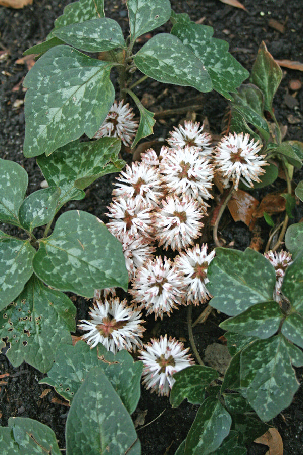 Most Pachysandra procumbens in the trade are from cooler climates. So when we stumbled across this attractive clone near the gates of Louisiana's Angola Prison in spring 1999, we thought we'd better get the hell out of there, but not without a piece of this attractive heat-loving clone. After six years, this selection had made a stunning 4' wide clump in our garden, and subsequently became a 2006 Plant Delights/JLBG introduction. The new foliage on Pachysandra procumbens 'Angola' is heavily patterned pewter against the olive-green base color, making an attractive combination. Foliage matures to mostly green by summer. Starting in early March (NC), the patches are adorned with a stunning floral show of masses of sweetly fragrant 4" tall stalks of white, bottlebrush-like flowers. This is hands down the earliest and best flowering clone of Pachysandra procumbens we've ever seen...great when used as a groundcover in the woodland garden.