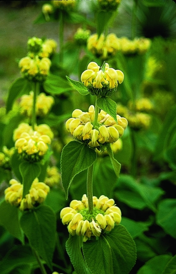 This deciduous perennial phlomis has large, arrow-shaped, felty leaves of gray-green that form an attractive clump to 18" wide. In late spring, the clumps give rise to 40" stalks interspersed every few inches with flower heads resembling battered, yellow golf balls...a great bold textured perennial.