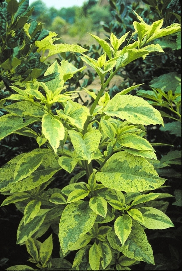 In 2001, we introduced this fascinating form of the ubiquitous, deer resistant native (Canada south to Florida and west to Texas), that we named after its originator, NJ plantsman Steve Silberstein. Phytolacca 'Silberstein' makes a stunning 5' tall garden specimen that's narrow at the base and wide at the top. The thick red stalk, is clothed with large oval leaves, heavily frosted with creamy white speckles, occasionally with branches that mutate to a green central pattern. The speckles are stunning against the bright red stems and purple fruit that hangs like grapes from the branches in late summer. Phytolacca 'Silberstein' will seed underneath the original plant, but almost all the seedlings are variegated...enjoy teasing your neighbors with this one!
