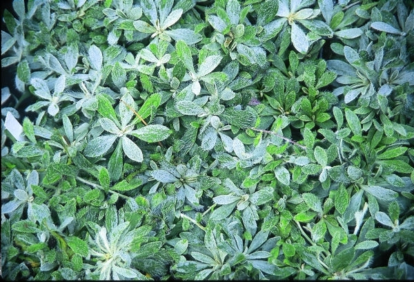 (aka: Hieracium pilosella) This superb, surface-spreading groundcover has long been one of our favorites. The felty, silver-grey foliage makes small rosettes that spread by above-ground stolons...slowly for us, although some references indicate reports to the contrary. In early summer, the mats are topped with delightful, 1" light yellow flowers on 8" tall stalks. We use this in the woodland garden to provide dramatic accents around the base of other plants...not bothered by heat and humidity!
