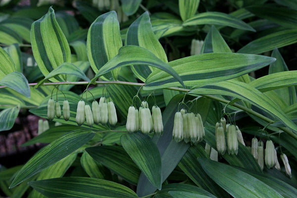 Polygonatum falcatum 'Nippon Sunbeam' is another variegated foliage selection of Asian Solomon's seal. The 30" long arching stalks are adorned with 6" long green leaves, each highlighted by irregular, creamy yellow, longitudinal striping. The attractive foliage is adorned with up to 50 attractive, dangling, creamy white, tubular flowers in early May (NC). Starting in late August, the stalks are laden with clusters of purple-black fruit (2-4 berries per cluster) that dangle beneath. Polygonatum falcatum 'Nippon Sunbeam' forms an easy-to-grow 2' wide clump in 5 years.