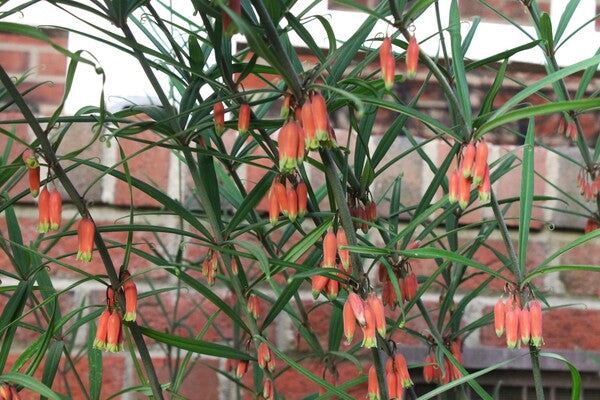 True elegance! Polygonatum kingianum 'Bellagio' is our 2019 Plant Delights/JLBG introduction of a prolific offsetting selection of the Chinese climbing Solomon's seal. Polygonatum kingianum 'Bellagio' emerges from a thick dormant rhizome in early spring as a round green stalk that stands sturdy to 3-4' tall. As it grows taller, it prefers to climb through its neighbors, using its cirrhifoliate (the old-fashioned way to hook up) leaves. When mature, a stalk can easily reach 9' tall, although 5' tall is more typical for most gardeners. In spring, the leaf axils of Polygonatum 'Bellagio' are adorned with clusters of attractive bell-shaped orange flowers with chartreuse tips...truly an elegant showstopper.