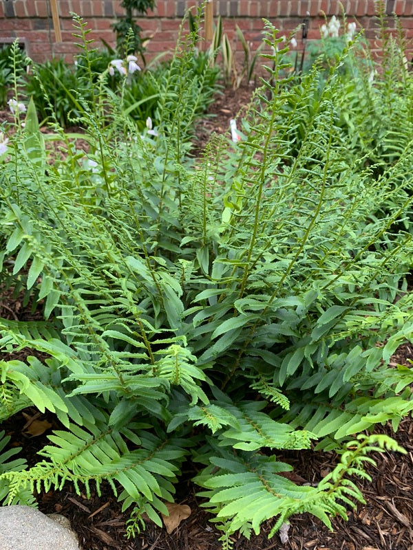 Evergreen groundcovers which do not spread or require maintenance are invaluable in the woodland garden, and Christmas fern provides both. Ferns provide a wonderful textural contrast between bolder textured plants like hosta, asarum, and Solomon's seal.
