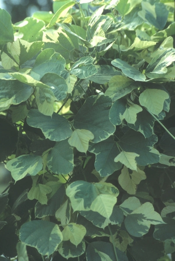 For the gardener who has everything or as the perfect gag gift for a garden party, yes, it's variegated kudzu. Originally discovered in Japan, it was named by plantsman Barry Yinger, who's never met a variegated plant he didn't like. This fast-growing deciduous vine...rumors of several feet per hour when established are probably true...is covered with lovely trifoliate light green leaves edged in white. The vines are adorned with small clusters of Nu-grape soda smelling flowers in late summer. If you 're going to have a weed, it might as well be variegated. Not recommended for states where it has been banned, and because there are so many, we won't ship out of state.