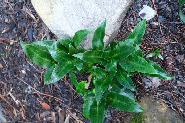 Pyrrosia hastata 'Storm Watch' is our 2023 introduction of a formerly un-named selection of the Asian (China, Korea, Japan) native, which in situ grows as an epiphyte (a very clingy plant). In the garden, the evergreen Pyrrosia hastata forms a 1' tall x 2' wide, tight clump with great age. The three-pronged felty leaves are typically solid green, but this selection we obtained from a Japanese plant collector has dramatic black leaf veins. We have had excellent luck with these in the ground when planted on a dry slope. In containers, they also form exceptional specimens.