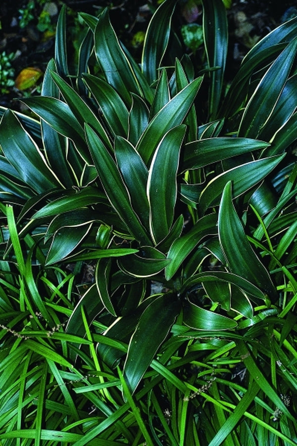 We obtained this fabulous rohdea from California, where it was grown in a private Japanese garden for many years. The 8" tall x 15" wide evergreen rosettes are composed of dark green outward stretching leaves, each edged with a narrow white band from the leaf tip to the base. Rohdea japonica 'Herbie' is also one of the fastest-multiplying rohdeas that we have grown. Just like other rohdea, the clumps are adorned with short stalks of bright red berries in the winter.