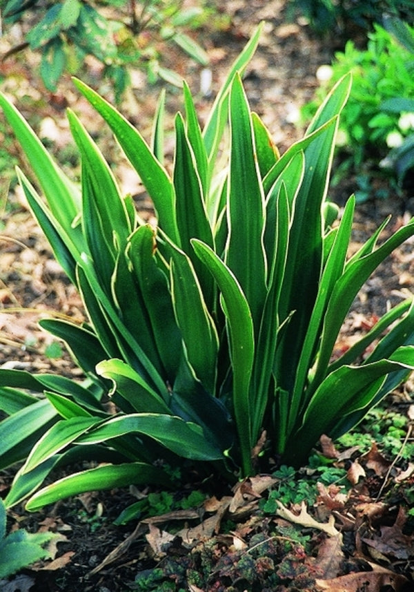 Like an evergreen tropical-looking hosta, Rohdea japonica 'Miyako-no-Jo' is composed of glossy, dark green, smooth leaves that stand upward forming a vase-shaped 20" tall clump. Each leaf is surrounded by a striking border of white from the leaf tip down to the mid-way point. Adding to the beauty are the short stalks of bright red berries that occur near the base of the plant in late fall and through the winter. Rohdea japonica 'Miyako-no-Jo' is a great evergreen specimen plant in the woodland garden among ferns. Rohdea 'Miyako No Jo' translates to "rohdea of Kyoto Castle."
