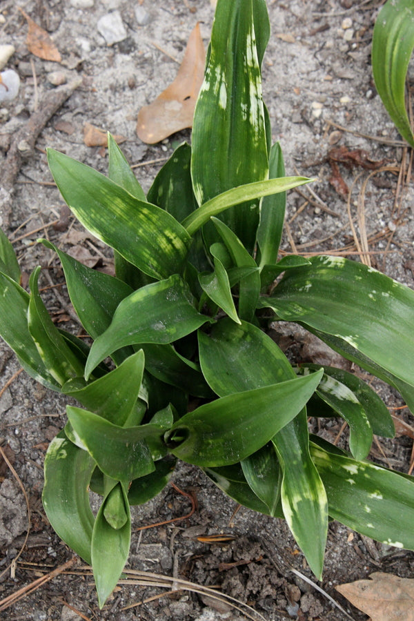 Rohdea japonica 'Yori-Kaku-no-Matsa' forms a compact 8" tall x 15" wide clump of rosettes that emerge green before showing the uneven horizontal creamy white banding that appears in late summer and persists during the winter as a nice colorful backdrop to the stalks of bright red fruit.