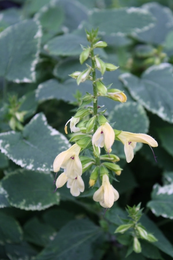 This variegated salvia is a Barry Yinger introduction from Japan. Salvia 'Fuji Snow' has a growth habit similar to Salvia koyamae (but half the size) with hairy green leaves that form a basal rosette which expands to a 2' wide clump. Each leaf is surrounded by a white margin that becomes muted during the hot weather. During late summer, the clumps are smothered with 18" stalks of light yellow flowers...WILD AND WONDERFUL!