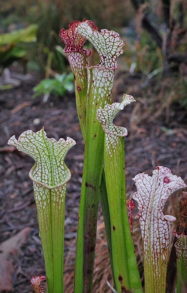 Sarracenia leucophylla 'Hurricane Creek White' is a seed strain of white-topped pitcher plants introduced by plantsman John Hummer from plants from the now-destroyed site in Hurricane Creek, Alabama. The 2' tall pitchers begin forming in May (NC) and are green at the base with a netted white hood that only shows the red-veining as they age. As with all Sarracenia leucophylla forms, Sarracenia 'Hurricane Creek White' forms a second abundant crop of new pitchers in late summer and early fall. The red flying saucer-like flowers top the clump in late April.