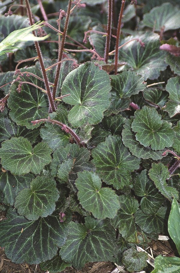 From high in the mountains of Japan's Kinki Peninsula comes this Bleddyn and Sue Wynn-Jones collection BSWJ4972. In appearance, Saxifraga 'Kinki Purple' is similar to Saxifraga 'Maroon Beauty' with 3" rounded, purple-backed leaves overlaid with wine-red in spring. Each leaf is covered in long red hair that insects have to shave before eating. Each rosette sends out 1' long, bright red threads that drop to the ground like fireworks, sprouting new plants where they land. In 5 years, expect a 3' wide patch, topped in May and June with a marvelous show of 1' spikes composed of small, airy, white flowers. We have found Saxifraga stolonifera will tolerate dry soils, but a moist, well-drained site is preferred.