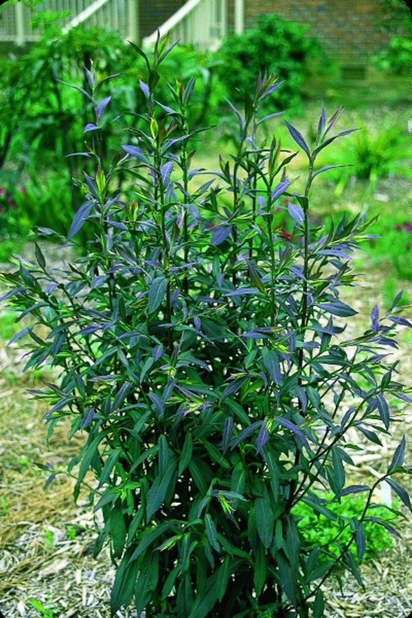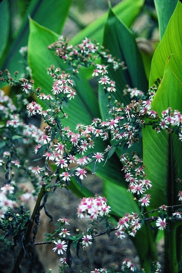 (syn: Symphyotrichum lateriflorum) This is an exciting Dutch selection of our native aster from the garden of Herman Van Beusekom. From a dormant crown in late spring, the 3' tall rigid stems rocket upward, branching as they grow like fireworks exploding. Each stem is clothed in very tiny, black-purple leaves. In late summer, the architectural stems are tightly covered in small, white, star-shaped flowers. A. 'Lady in Black' is a great addition to borders and large floral arrangements alike!