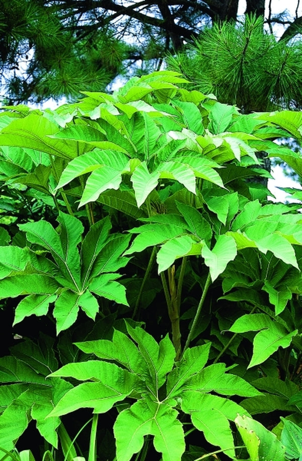 For a truly tropical look in a temperate garden, Tetrapanax 'Steroidal Giant' is a plant for you! Giant rice paper plant can reach the epic size of 25' tall from Zone 8b south (compared to 10' for the typical species). In dieback climates, expect only half this height...a measly 10-12'. The brown hairy stalks are clothed with giant 3-5' wide, fuzzy, castor bean-shaped leaves. Tetrapanax 'Steroidal Giant' root suckers underground, although less than the typical form, and fortunately it's easy to remove. Tetrapanax papyrifer 'Steroidal Giant' first came from a gardener in Japan to Hawaii, then to the California Bay area, thanks to nurseryman Ed Carman, who kept it in a 1-gallon pot for 20 years. It was seen by plantsman Roger Warner, who, thinking it was a dwarf, planted a piece in the ground. As the story continues, after the size shock, Roger shared a piece with Sean Hogan, who graciously shared with us...whew! Thanks, guys...for a dazzling new introduction.