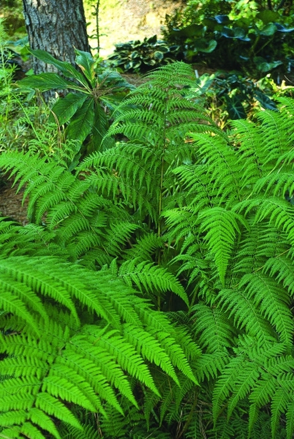 We collected spores for this tropical East Indian native on a trip to Bermuda and planted out the resulting plants, expecting them to expire when winter arrived. Instead, they got bigger and better each spring. We prize Thelypteris torresiana for its large size (3' wide x 3' tall) and resemblance to tree ferns, which we specialize in killing. This easy-to-grow deciduous fern makes a stunning addition to the woodland garden. Fern guru Dr. John Mickel says in his book, "It should be used more outdoors in the southern United States..." T. torresiana naturalizes in the Deep South and is not a good choice from Zone 9 south where it can escape into natural areas.
