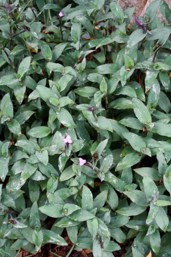 Tradescantia pallida 'Blue Sue' is a north Florida pass-along plant that went from plantswoman Sue Watkins of Tallahassee, Florida, to perennial guru Allan Armitage, who was so taken with it that he named the plant after Sue. Tradescantia pallida 'Blue Sue' is an excellent deciduous groundcover from Zone 7b south that thrives in most garden conditions from sun to light shade. The 2" wide x 5" long glaucous blue leaves clasp the upright dark purple stems which, in turn, form an 18" tall x 5' wide patch in 10 years. With any sun exposure, the leaves also showcase a lovely purple border. Starting in late June (NC), the stems are adorned with small, diurnal lavender flowers emerging from the leaf axils. This is truly a durable groundcover that's great for underplanting around open shrubs and roses.
