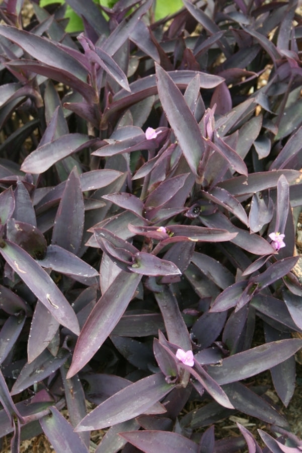We love this giant leaf form of the native North American purple heart spiderwort. We visited California's Mike Kartuz in 2004 to inquire about its origin, but the trail went cold. Regardless, Tradescantia 'Kartuz Giant' makes an impressive 3' wide, deer-resistant clump of dusty purple foliage that is three times the size of the typical species. In early summer, the clumps are topped with the typical small, light lavender flowers. For us, it's great in the border for summer color, but in colder climates Tradescantia pallida 'Kartuz Giant' makes a nice accent in baskets and summer color bowls.